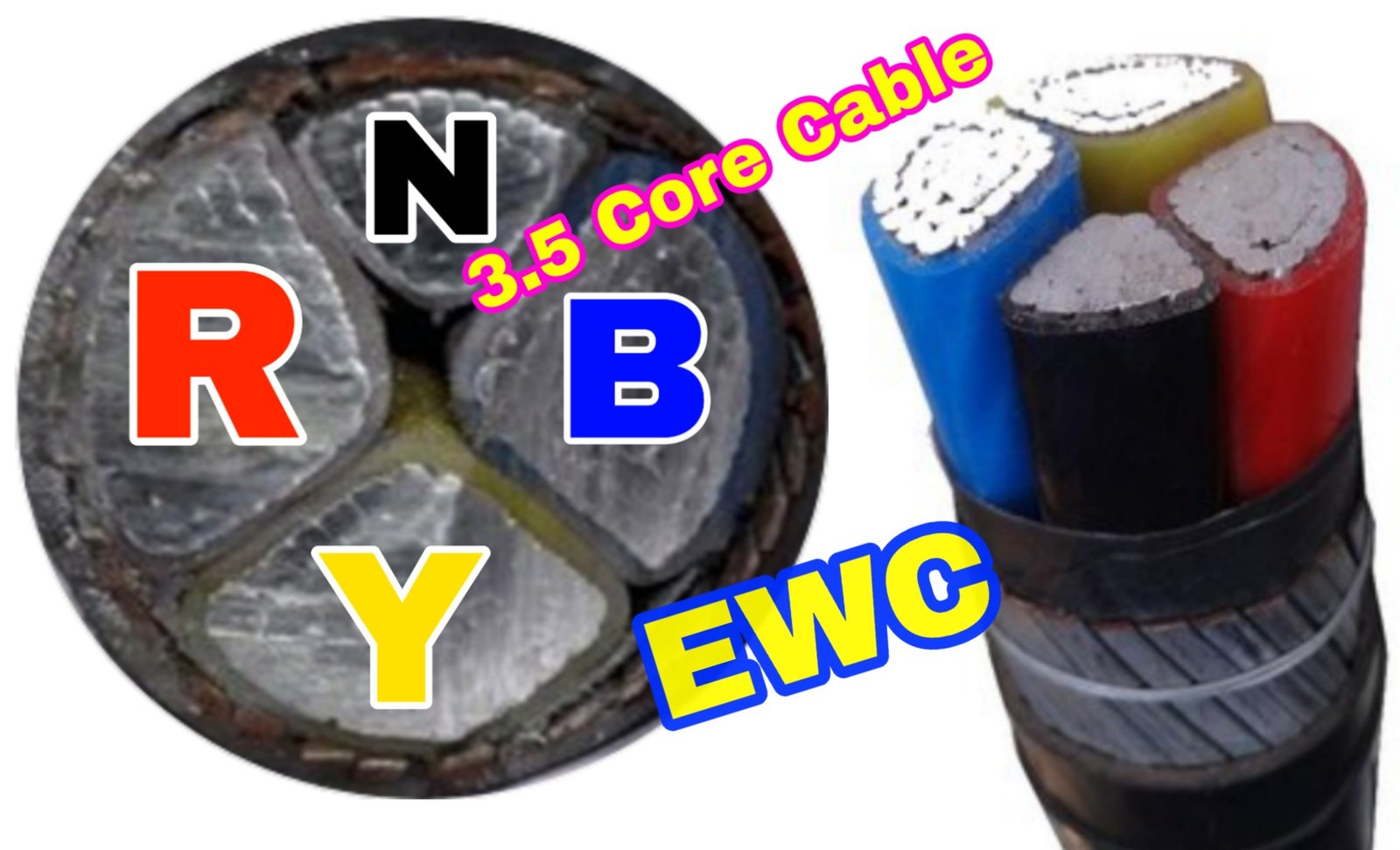 3.5 core cable. यह एक इलेक्ट्रिकल में पावर केबल है जिसमें टोटल चार कोर होता है लेकिन इसे थ्री एंड हाफ कोर 3.5 core cable इसलिए कहा जाता है क्योंकि इसमें तीन वायर केबल मोटा होता है और एक वायर केबल पतला होता है इसका तीन फेज लाइन के लिए एक बराबर साइज 3 वायर केबल होता है और एक हाफ जो तीनों फेज लाइन वायर केबल से पतला होता है जिसका साइज जितने एमएम का केबल होता है उसका लगभग आधा एमएम साइज होता है आधा एमएम के आसपास में जो साइज का केबल आता है उस साइज का न्यूट्रल वायर केबल का साइज होता है । जैसे 35 एमएम 3.5 कोर केबल 35mm 3.5core cable. में 3 फेज लाइन के लिए 35 एमएम का वायर केबल होता है (Phase_R,Y,B,_35mm_wire_cable) और न्यूट्रल के लिए 16 एमएम का वायर केबल होता है (Neutral_Black_16mm_wire_cable)